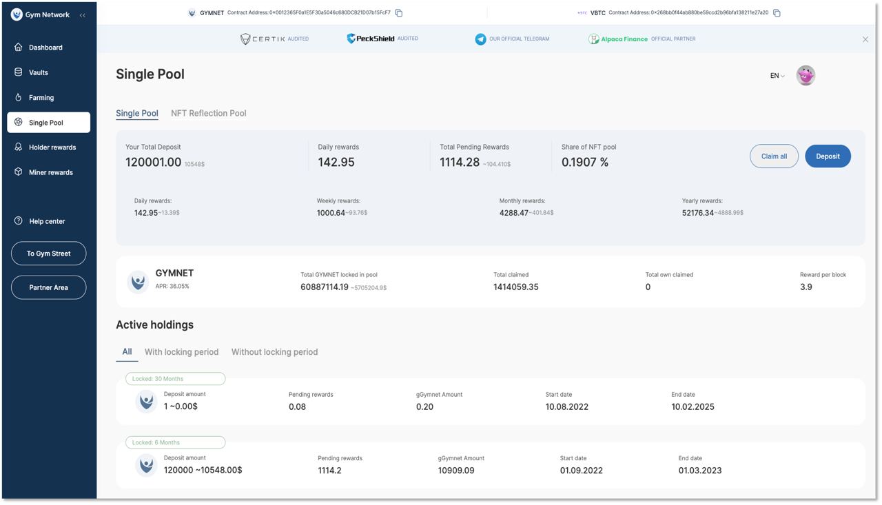 특정 기간 동안 GYMNET Single Pool에 일정량의 GYMNET 토큰을 넣은 채 잠금을 걸어둘 경우, 잠금 기간 동안 보상으로 GYMNET과 gGYMNET 토큰을 모두 받을 수 있습니다. Single Pool은 GYM NETWORK가 투자자를 위해 만든 투자 옵션 중 하나입니다. Single Pool은 투자자들에게 패시브 인컴을 창출하는 것 이상의 역할을 하며, 투자자들에게 GYM NETWORK DAO(새 기능 추가, 로드맵 조정 등 플랫폼과 관련된 의사 결정에 투표할 수 있는 권리)에 대한 액세스 권한을 부여합니다.
